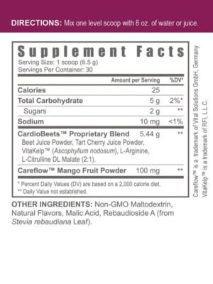 CardioBeets is a refreshing and flavorful drink with a hint of cherry, and mango. It contains no added sugar, no preservatives, no artificial colours or flavours, and no gluten.