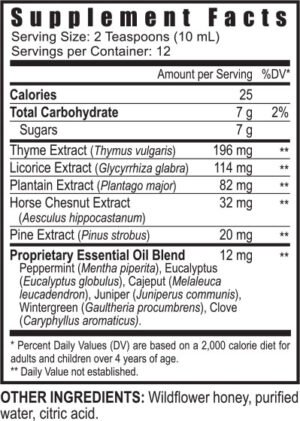 Thyme Extract, Licorice Extract, Plantain Extract, Horse Chesnut Extract, Pine Extract, Proprietary Essential Oil Blend [Peppermint (Mentha piperita), Eucalyptus (Eucalyptus globulus), Cajeput (Melalueca leucadendron), Juniper (Juniperus communis), Wintergreen (Gautlheria procumbrens), Clove (Caryphyllus aromaticus)], wildflower honey, purified water, citric acid.