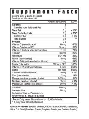 Vitamin C, Vitamin D, Vitamin E, Thiamine, Riboflavin, Niacin, Vitamin B6, Folate, Vitamin B12, Biotin Calcium, Zinc, Manganese, Citrulline, Lactobacillus, (L. Acidophilus, L. Plantarum, L. Rhamnosus, B. Breve, B. Lactis, Xylitol, Erythritol, Natural Flavors, Citric Acid, Fruit Blend (Strawberry and Raspberry Powder), Natural Coating, Silica