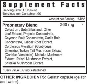 Colostrum, Beta Sitosterol, Olive Leaf Extract, Propolis Concentrate, Cayenne Fruit Concentrate, Garlic Bulb Concentrate, Ginger Root Extract, Cordyceps Mycelium (Cordyceps Sinensis), Turkey Tail Mushroom Extract (Coriolus Versicolor), Maitake Mushroom Extract, Reishi Mushroom Extract, Shiitake Mushroom Extract, Gelatin Capsule.