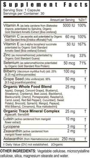 | Organic Whole Food Blend (includes Apple, Orange, Concord Grape, Blueberry, Strawberry, Cranberry, Beet Juice, Blackberry, Blackcurrant, Cherry, Pomegranate, Raspberry, Carrot Juice, and Red Bell Peppers). | A blend of fruits and vegetables known to support eye health. |