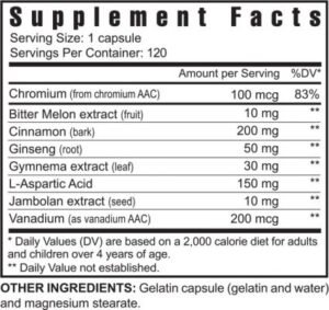 Chromium, Bitter Melon Fruit Extract, Cinnamon Bark, Ginseng Root, Gymnema Leaf Extract, L-Aspartic Acid, Jambolan Seed Extract, Vanadium, Gelatin, Magnesium Stearate