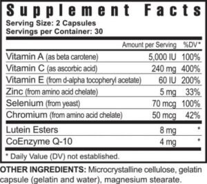 Ultimate Vision Fx is formulated to support healthy eye function. It also features an exclusive blend of Vitamin A (as beta carotene), Vitamin C, Vitamin E, Zinc, Selenium, Chromium, Lutein, and Co-enzyme Q10.
