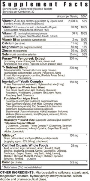 Vitamin A, Vitamin C, Vitamin E, Vitamin B6, Magnesium, Zinc, Selenium, Furan-T , T- Nutrient Blend, Tribulus terrestris, Turmeric, Garlic Extract, Glycine propionyl-L-Carnitine, Rhodiola Rosea Extract, L Histidine, L-Phenylalanine Imortalium Youth Complex, Trans Resveratrol, Full Spectrum Whole Food Blend from Grape Seed Extract, Wild Blueberry, Quercetin, Resveratrol, Wild Bilberry, Cranberry, Tart Cherry, Prune, Raspberry Seed, Strawberry Fucoidan-Rich Algae Blend Fucaceae, Laminaria Brown Algae, Irish Moss, Dulse, Red Seaweed, Spirulina Algae, Bladderwrack, Hijiki, Wakame, Nori, Kombu, Regeneryll Brand SOD: Superoxide Dismutase plus Bioperine Telomere Support Blend L-Glutamine, Catalase, Thione Complex (Glutathione, Selenium, N-Acetyl-Cysteine, Grape Seed Extract) Alpha Lipoic Acid